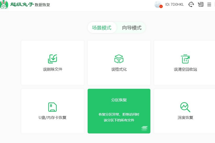 1. 下載安裝超級兔子硬盤數據恢復工具,打開軟件后點擊選擇場景模式下的分區恢復。