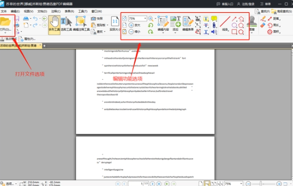 首先在電腦上打開編輯工具,點擊首頁左上方的【文件】按鈕,在彈出的窗口界面中打開PDF文件了。使用PDF編輯器打開PDF文件后,我們還可以對PDF文件進行編輯操作,如刪除頁面、插入頁面、拆分文檔以及裁剪頁面等。