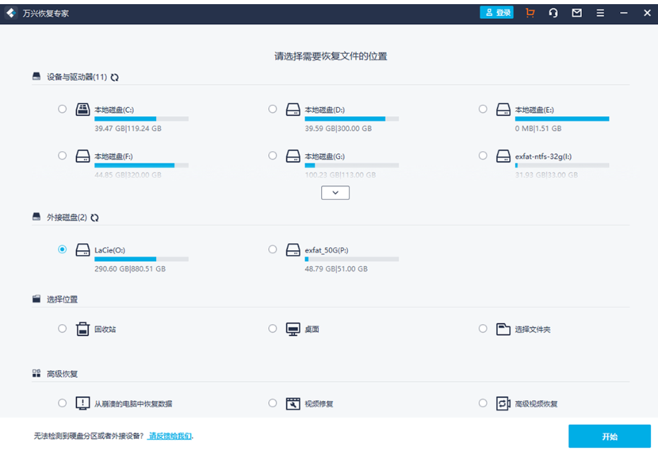 1、在電腦上運行萬興恢復專家,通過數據線連接移動硬盤,軟件會自動識別外接存儲設備,然后在軟件界面點亮【外接磁盤】欄目中移動硬盤,點擊右下角的“開始”按鈕。