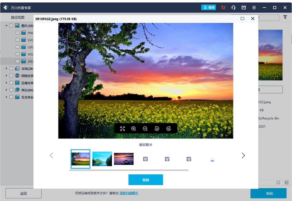 3、用戶通過【文件視圖】這種模式找到丟失的目標文件,直接可在右側直接預覽或者是點擊放大預覽,同時可以通過搜索關鍵詞來查找需要恢復的文件,確認后點擊右下角的“恢復”按鈕即可。