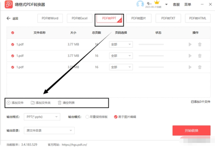 3、添加完成后,可以修改下方的輸出格式,根據需求勾選是否需要保持排版和是否需要易于圖片編輯,根據輸出存儲文件位置修改輸出目錄,最后點擊“開始轉換”就完成了。