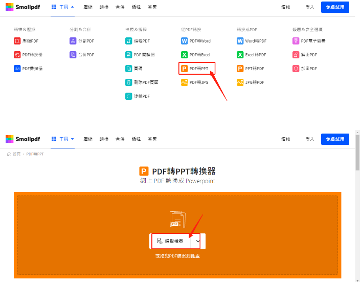 smallpdf是一個網頁版的PDF編輯工具,如果我們不想下載安裝軟件的話,就可以直接登錄在線快速編輯PDF文件,操作方法十分簡單,打開網站之后,點擊上方的【工具】,在下拉菜單中找到【PDF轉PPT】功能,然后將需要轉換的PDF文件導入之后就可以轉換了。