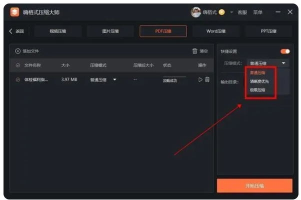 2、轉到PDF壓縮界面,添加我們需要改變大小的PDF文件,并在軟件右側選擇合適的壓縮模式,如普通壓縮等。