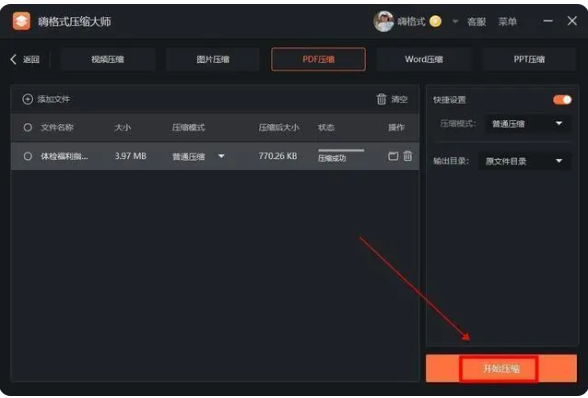 3、設置好以上內容后,點擊右下角的“開始壓縮”按鈕,稍等一會PDF文件大小就被壓縮完成了,即可輕松實現PDF文件大小的改變。