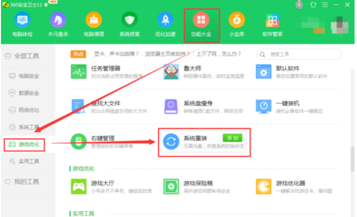 如果說方法一用不了,一般我們常用的360安全衛士里也有重裝系統工具可用來幫助還原重裝系統,具體的步驟如下: