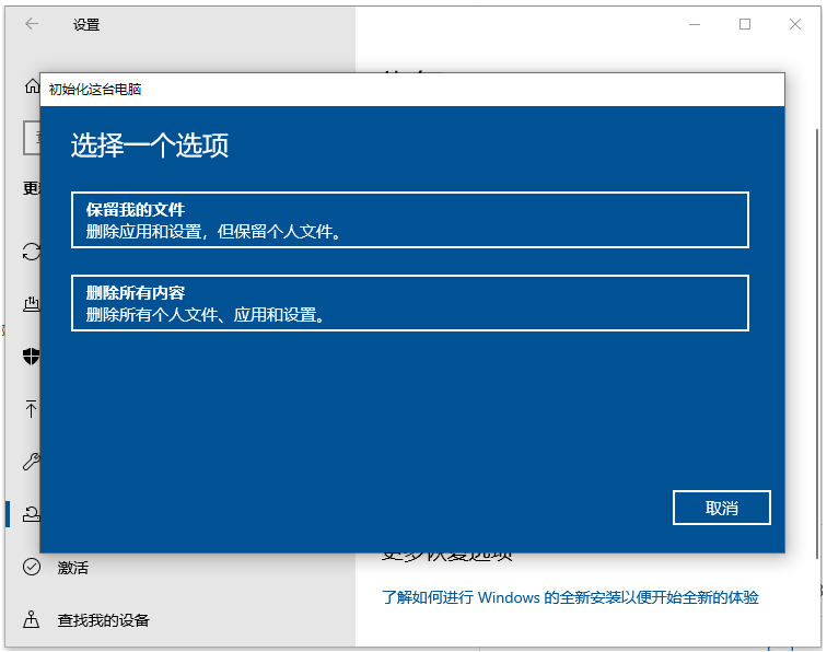 4、在初始化界面中,根據需要自行選擇是否保留文件即可。