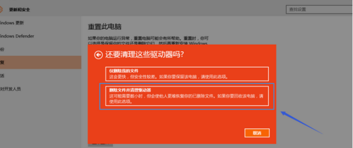 6、可以選擇第二項“刪除文件并清理驅動器”,等待系統重置完成即可。