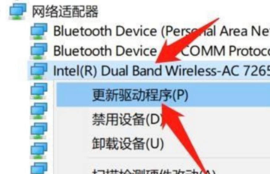 3、展開【網絡適配器】,鼠標右鍵【Intel(R) Dual Band Wireless-*C 7265】點擊【更新驅動程序(P)】。