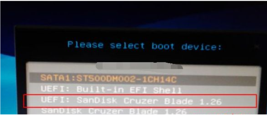 3、重啟后不停按F12或F11或Esc等啟動快捷鍵,調出啟動菜單對話框。選擇識別到的U盤選項,一般是U盤名稱或者帶有USB字樣的,比如SanDisk,如果要uefi模式下安裝,選擇帶UEFI模式的項,按回車鍵進入。