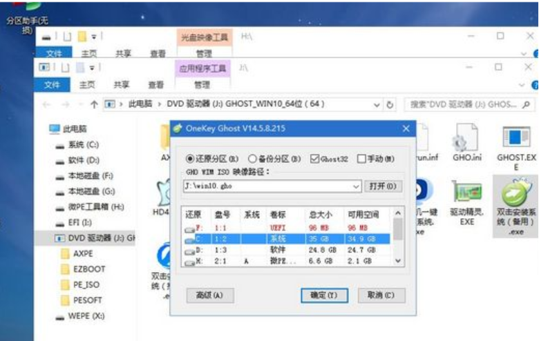 9、雙擊【雙擊安裝系統.exe】,運行安裝工具,選擇【還原分區】,GHO WIM ISO映像路徑會自動提取到win10.gho,接著選擇安裝位置,一般是C盤,或者根據卷標或總大小來判斷,選擇之后,點擊確定。