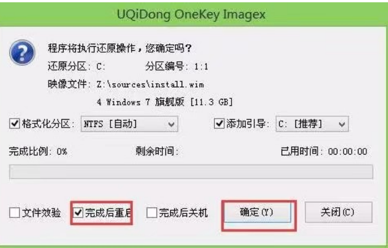 4、此時程序將執行還原操作,勾選復選框“完成后重啟”,單擊確定。