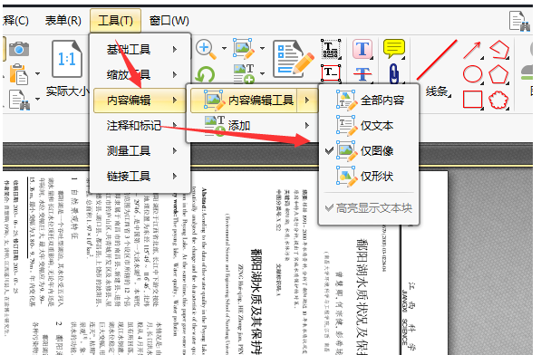 4.文件中的圖片修改,選擇內容編輯工具中的僅圖像,點擊鼠標右鍵,選擇編輯圖像或者是替換圖像即可修改了。