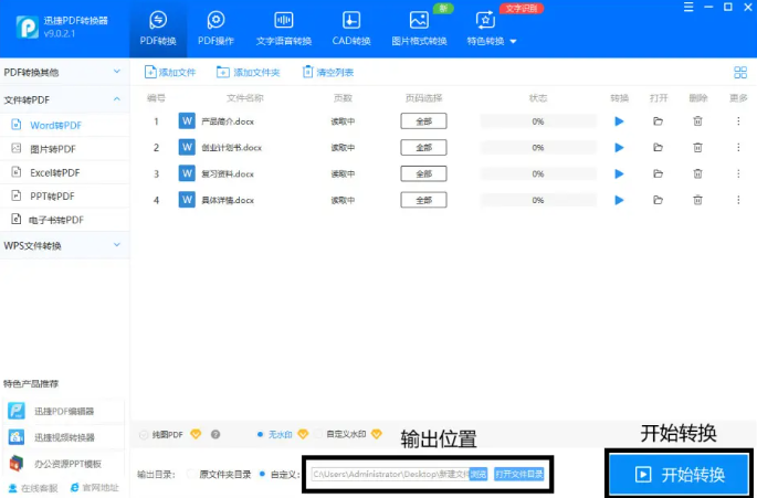 3、將文件的輸出位置在頁面下方進行設置,點擊【開始轉換】,Word文檔就會轉換成PDF文件格式啦。
