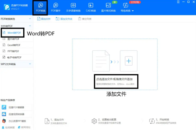 1、打開迅捷pdf軟件,在操作頁面中選擇【Word轉PDF】,點擊添加文件。