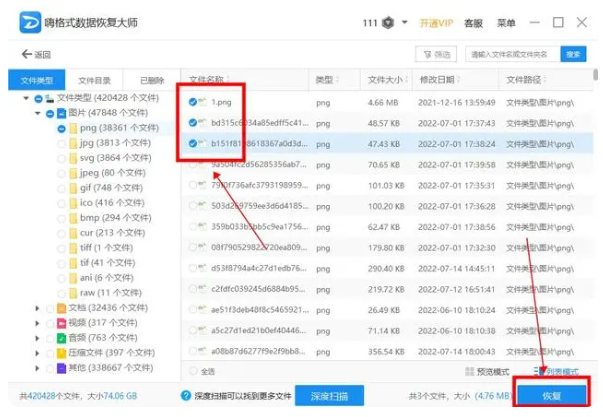 3、等待掃描完畢,掃描完成找到我們要恢復的文件,點擊恢復就可以了。如果首次掃描找不到您需要的文件,可以根據軟件提示點擊“深度掃描”即可恢復清空回收站的文件。