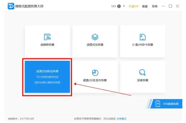 1、打開嗨格式數據恢復專家,進入主界面后,選擇需要的功能模式,這里就點擊“誤清空回收站恢復”;