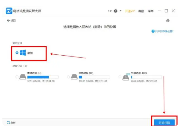 2、在這個軟件模式下,選擇下數據在丟失之前保存的位置,選好點擊“開始掃描”按鈕;