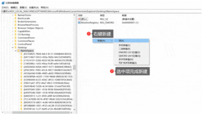 2、在注冊表首頁,根據給出的順序展開文件夾:HKEY_LOCAL_MACHINESOFTWARE、Microsoft、Windows、CurrentVersion、Explorer、DeskTop、NameSpace,在最后那個文件夾內新建一個項;
