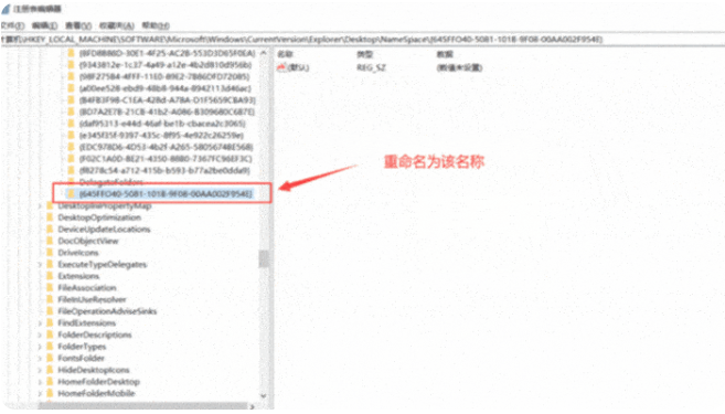 3、系統會給新建項默認命名,我們需要重命名為{645FFO40——5081——101B——9F08——00AA002F954E};