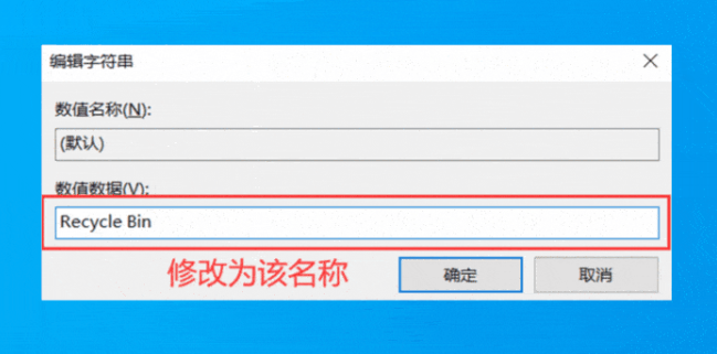 4、鼠標右鍵一下“默認”的那個文件,點擊修改,將數值數據改為“Recycle Bin”,隨即確定,修改完成后立即重啟電腦完成數據更新。