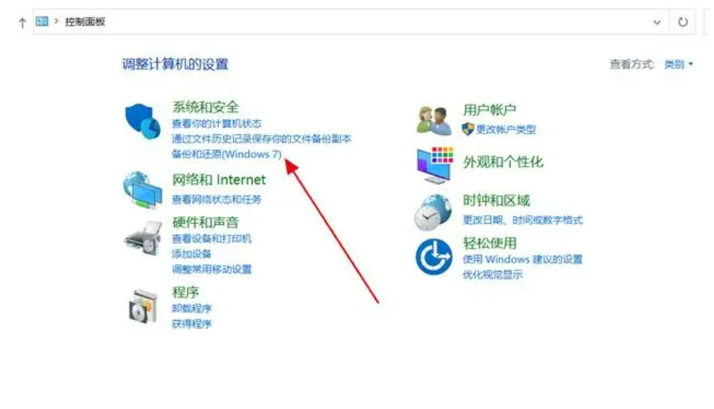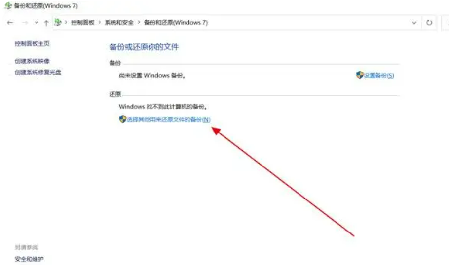 打開電腦“控制面板”,選擇“系統和安全”導航中的“備份和還原”功能。點擊“還原”。