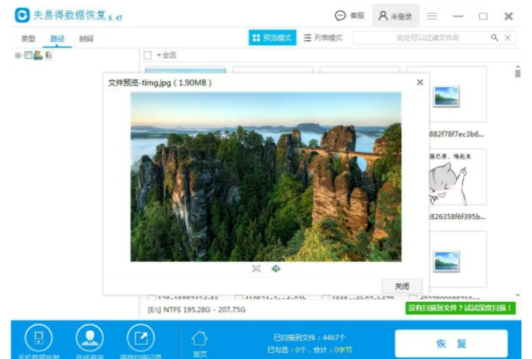 3、掃描完成,建議先切換到預覽模式,然后再對應的磁盤找到需要恢復文件的縮略圖,然后點擊縮略圖預覽查看文件的具體內容。