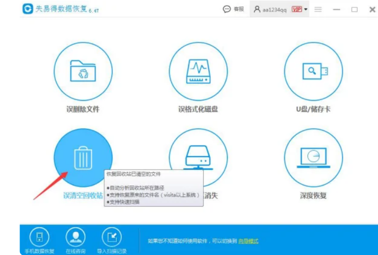 1、運行電腦里的數據恢復大師軟件,進入軟件主界面后,選擇【誤清空回收站】恢復模式來進行回收站數據恢復。