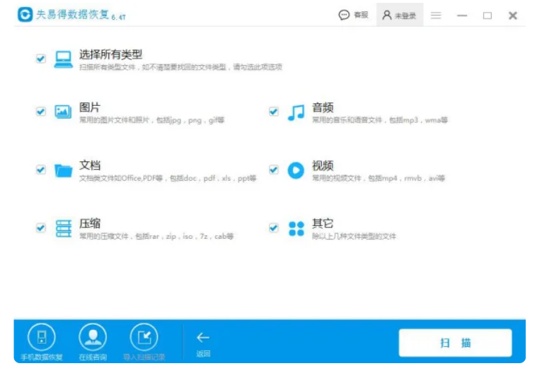 2、然后選擇需要恢復的文件類型,接著點擊【掃描】按鈕,進入掃描過程。