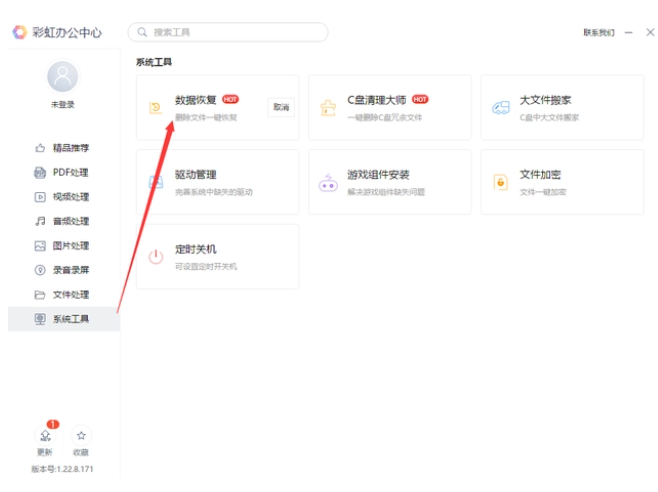 1、去官網下載啟動正版彩虹辦公中心,在系統工具中選擇數據恢復模式。進入到界面后如果快速掃描完成后找不到任何文件,請進入“全方位恢復”模式。與快速掃描相比,它將搜索更多文件并花費更多時間。