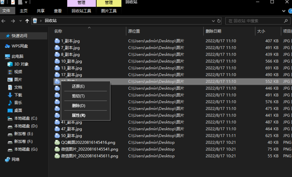 2、若是回收站長期沒有被清理過,數據會比較多,尋找文件就會比較費時間,這里可以按照數據的類型、名稱、大小、刪除的時間等進行排序搜索,這樣就更容易找到想要恢復的數據文件了。選擇需要恢復的數據,然后在點擊鼠標右鍵選擇【還原】選項即可將數據恢復到原始的位置中去。