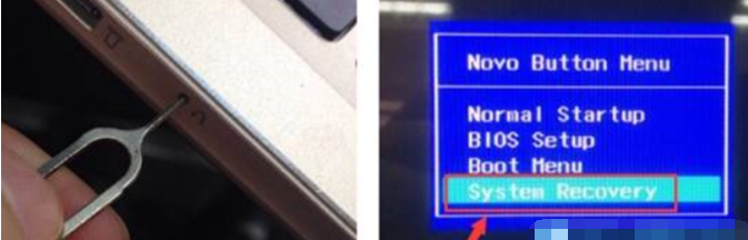 首先將電腦關機,可借助關機鍵強制關機都行。在關機狀態下,使用卡針插入筆記本的一鍵恢復小孔(不同筆記本恢復孔的位置不一樣),進入Novo Button Menu,按下方向鍵選擇,并回車System Recovery選項。