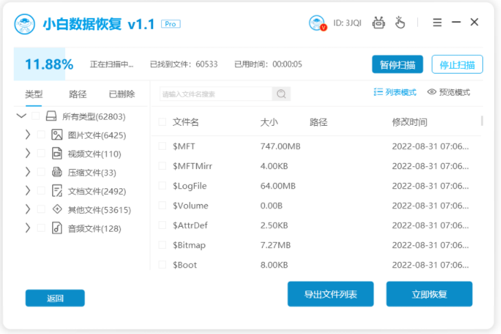 小白數據恢復軟件是一款功能強大的數據恢復找回工具,可以有效恢復硬件、軟件或人為誤操作引起的文件、數據丟失問題。小白數據恢復軟件支持硬盤、U盤、移動硬盤、電腦、內存卡、SD卡、CF卡、TF卡、相機卡、手機卡等多種設備文件恢復,可恢復文件類型包含照片、視頻、辦公文檔、壓縮包文件、音頻等,可恢復上千種文件格式,支持FAT16、FAT32、NTFS、exFat等多種文件系統,完美兼容全線Windows系統,極速掃描,邊掃描邊顯示,隨時可以恢復找到的文件數據。