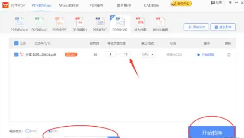 3、這時會打開可牛PDF轉換器界面,拖動PDF文件到操作區域。設置CAD格式為DXF或者DWG,并且支持自定義文件存放路徑,否則一般默認路徑都是C盤。檢查沒問題后,點擊開始轉換就可以了。