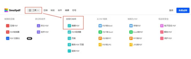 操作步驟:在瀏覽器中打開該網站,在上方工具一欄中選擇“編輯PDF”功能,將我們的PDF文檔導入進去。