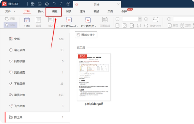 1、打開工具可以看到“開始”功能頁,選擇打開文件,打開需要編輯的文件。工具欄中選擇”編輯”功能,就可以對PDF文件中進行修改的內容或者排版等。