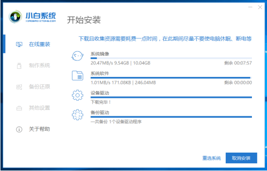 3、 等待系統鏡像、軟件、驅動等下載完成后就會自動重啟電腦進行安裝了。后面的步驟不需要自己手動操作。等待安裝完成進入系統就行。