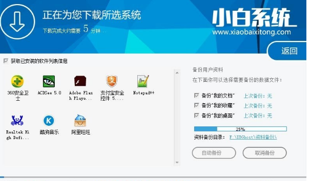 5、待小白系統下載正常后將彈出關于軟件信息以及C盤文件的備份,沒有特殊情況的話大家按照默認勾選讓它自動備份好就行了;