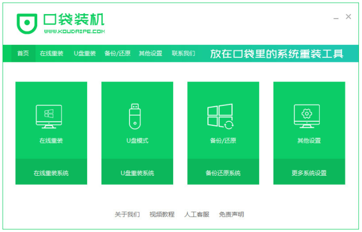 1、找到一臺可用的電腦,下載安裝口袋裝機一鍵重裝系統工具并打開,插入一個8g以上的空白u盤,選擇u盤重裝系統模式,點擊開始制作。