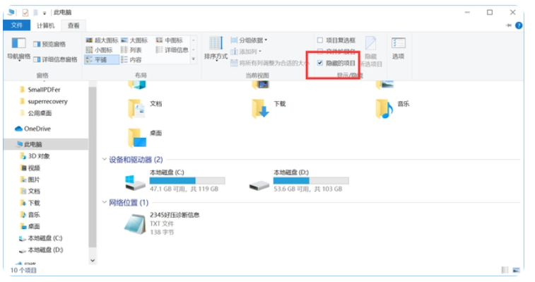 除了上面分享的兩個方法以外,如果您西部移動硬盤里的數據,不是剛剛右擊刪除的,而是因為設備中毒,導致原始數據被“隱藏”了。那么,完全不需要使用專業軟件或者其它的方式恢復,只需將被隱藏的文件屬性改為“可見”即可。首先,將移動硬盤連接到電腦上,然后在“我的電腦”菜單中打開U盤的盤符。然后,在頂部“查看”菜單中,將“隱藏的項目”勾選上,再次刷新一下即可查看數據了。