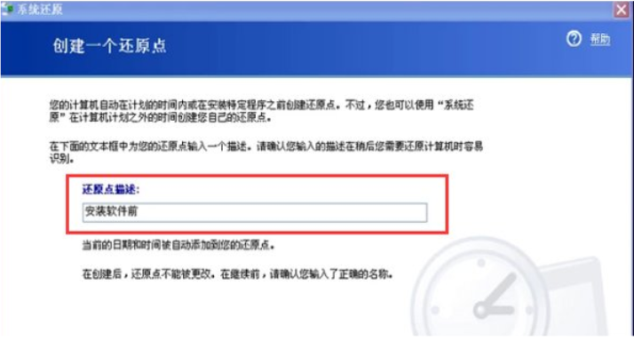 5、點開“創建一個還原點”對話框,輸入用來識別還原點的名稱,點擊“創建”。