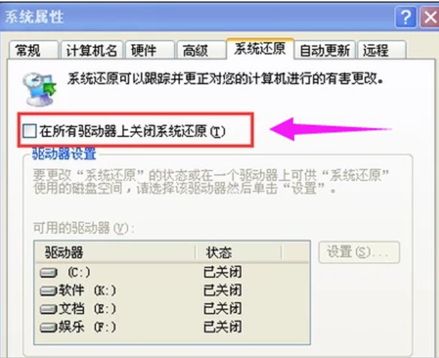 2、切換到“系統還原”選項卡。取消勾選“在所有驅動器上關閉系統還原”項。