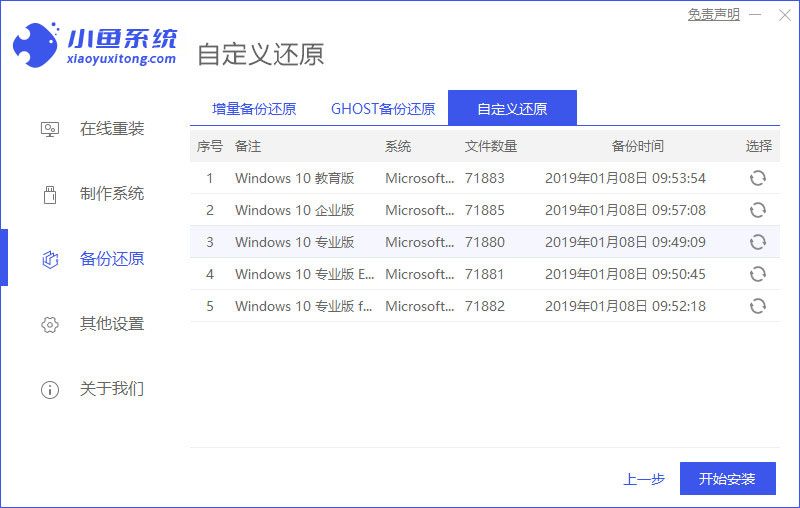 1、打開小魚軟件點擊備份還原,再點擊自定義還原選項卡,選擇備份還原的資料,點擊下一步。