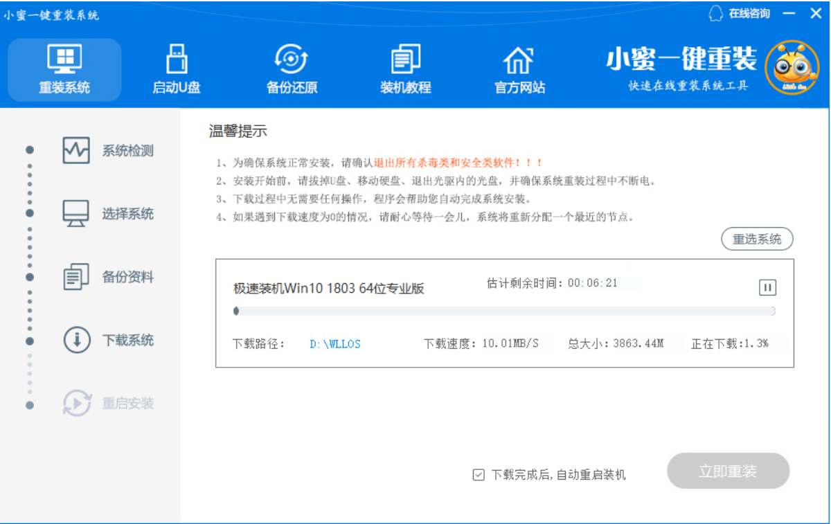 5、等待下載系統文件完成后系統自動重啟,進入桌面,完成。