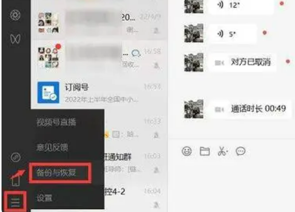 1、在電腦端跟往常一樣登錄微信,點擊右下角的三條橫線,再點擊【備份與恢復】。