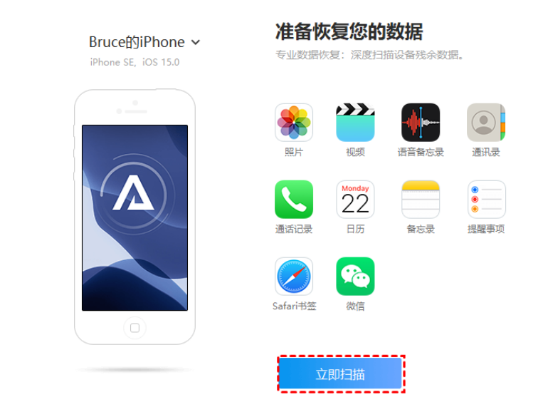 2. 將IOS設備連接到電腦,然后單擊“立即掃描”以掃描iPhone已經刪除的微信聊天記錄。