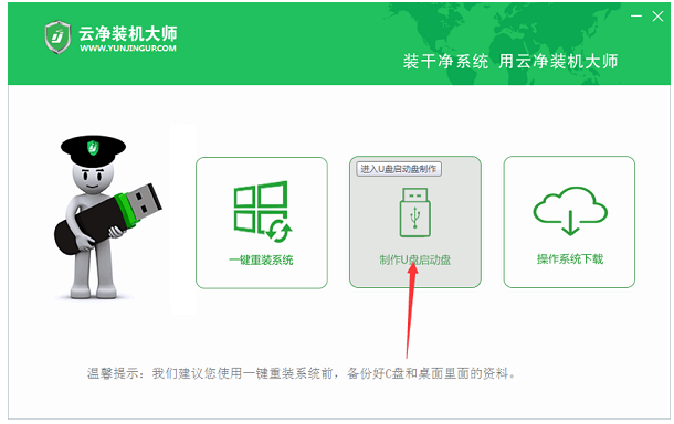 1、在可用的電腦上下載安裝云凈U盤啟動制作工具并打開,插入1個8g以上的空白u盤,點擊制作U盤啟動盤。