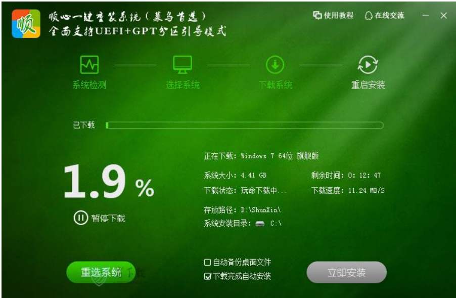 順心一鍵重裝系統基于一鍵備份還原作為基礎,自動檢測修復引導,采用迅雷引擎聯網下載最新系統,并且智能部署DOS/PE環境從而實現一鍵自動重裝系統,簡單高效,對新手用戶特別友好,軟件設計人性化,能分分鐘協助用完成重裝需求。