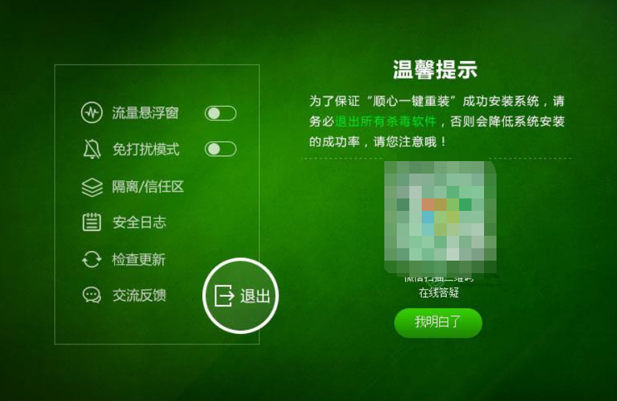 1、下載安裝順心一鍵重裝系統,關閉殺毒軟件,點擊“我明白了”進行下一步。