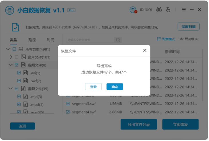 3、等待掃描完成后,選擇需要恢復的文件類型,點擊立即恢復,等待軟件對這些數據進行恢復。