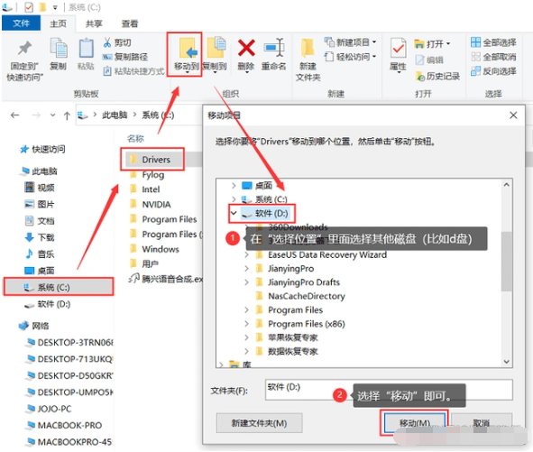 如果采用以上方法,c盤的空間仍然不足,這時需要對系統軟件進行遷移。我們只需打開c盤,選擇要遷移的文件,選中它,再點擊“遷移到”。在“選擇位置”里面選擇其他磁盤(比如d盤)即可。